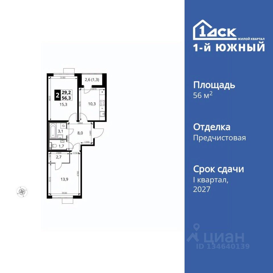 Продаётся 2-к квартира номер 481 общей площадью 56.3 кв.м. на 12-м этаже 24 этажного здания. Отделка Whitebox.
