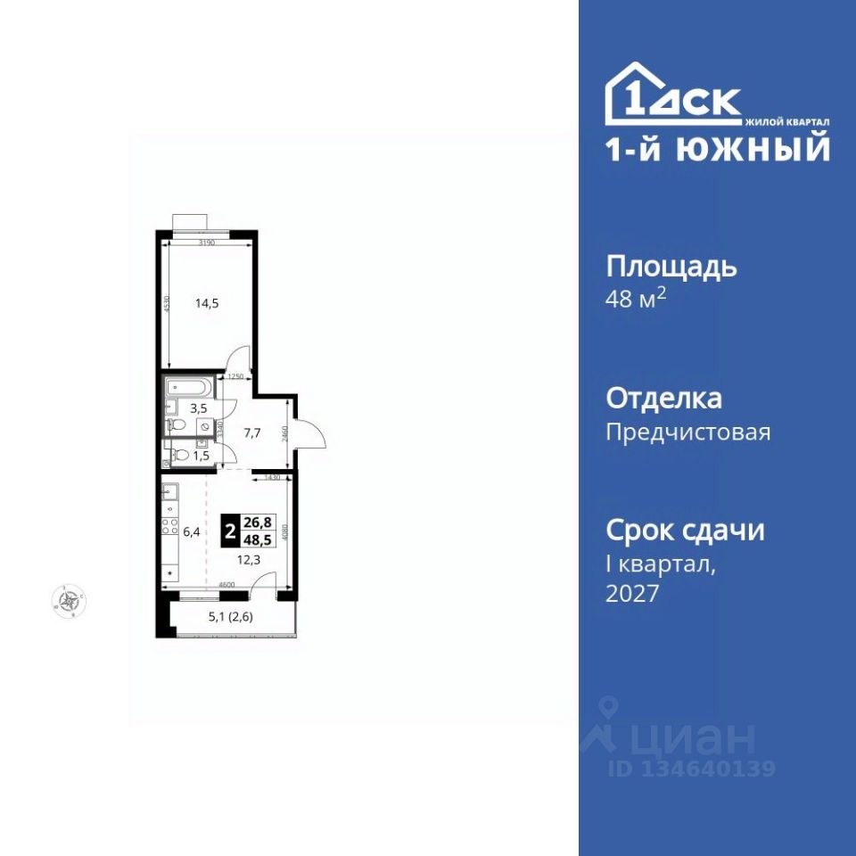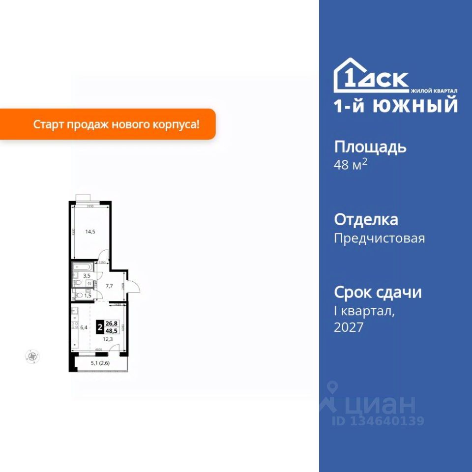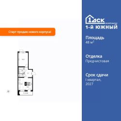 Продаётся 2-к квартира номер 570 общей площадью 48.5 кв.м. на 7-м этаже 24 этажного здания. Отделка Whitebox.