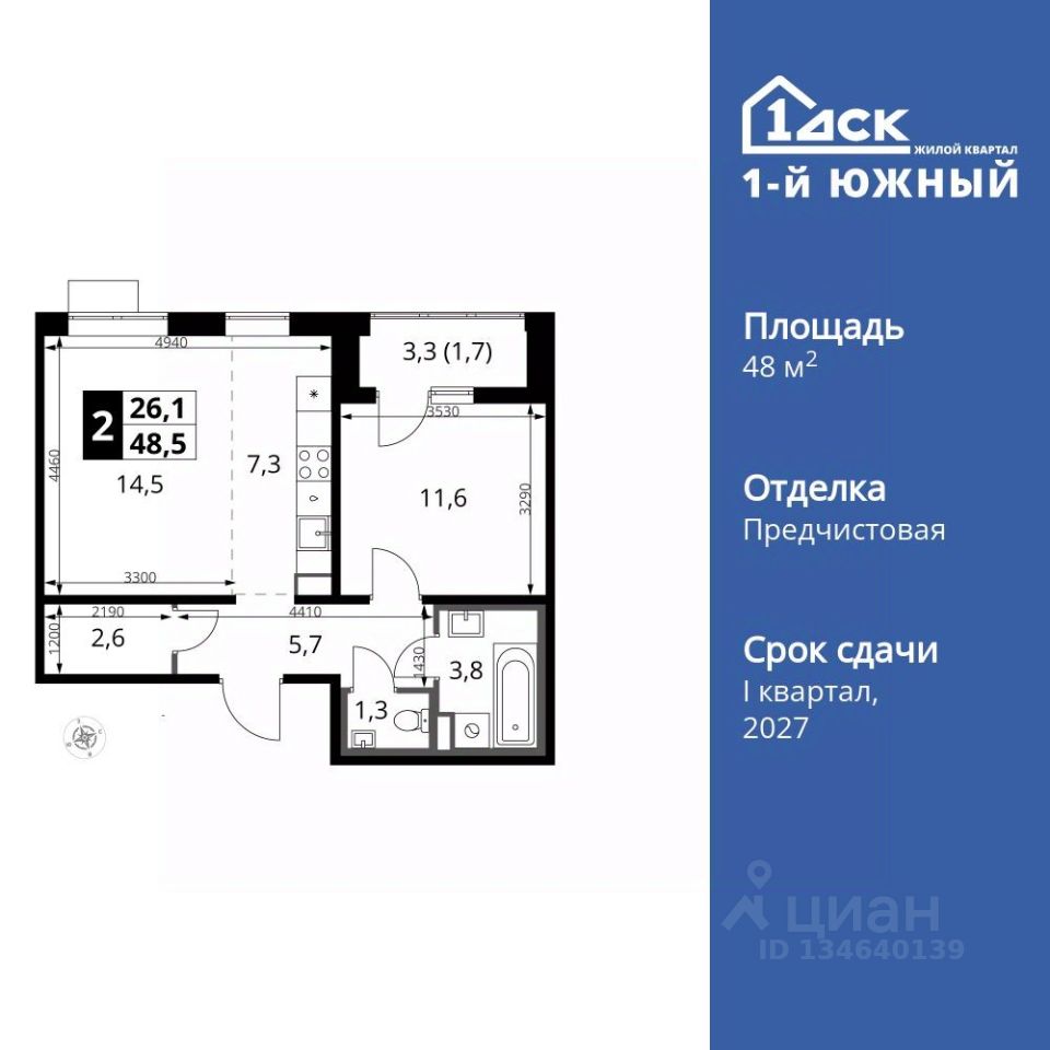 Продаётся 2-к квартира номер 629 общей площадью 48.5 кв.м. на 16-м этаже 24 этажного здания. Отделка Whitebox.