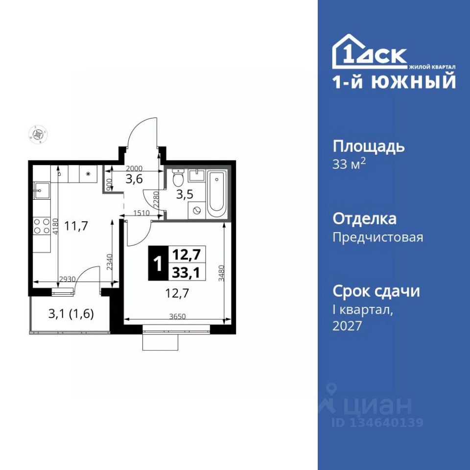Продаётся 1-к квартира номер 604 общей площадью 33.1 кв.м. на 12-м этаже 24 этажного здания. Отделка Whitebox.