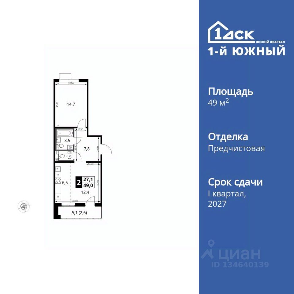 Продаётся 2-к квартира номер 689 общей площадью 49 кв.м. на 24-м этаже 24 этажного здания. Отделка Whitebox.
