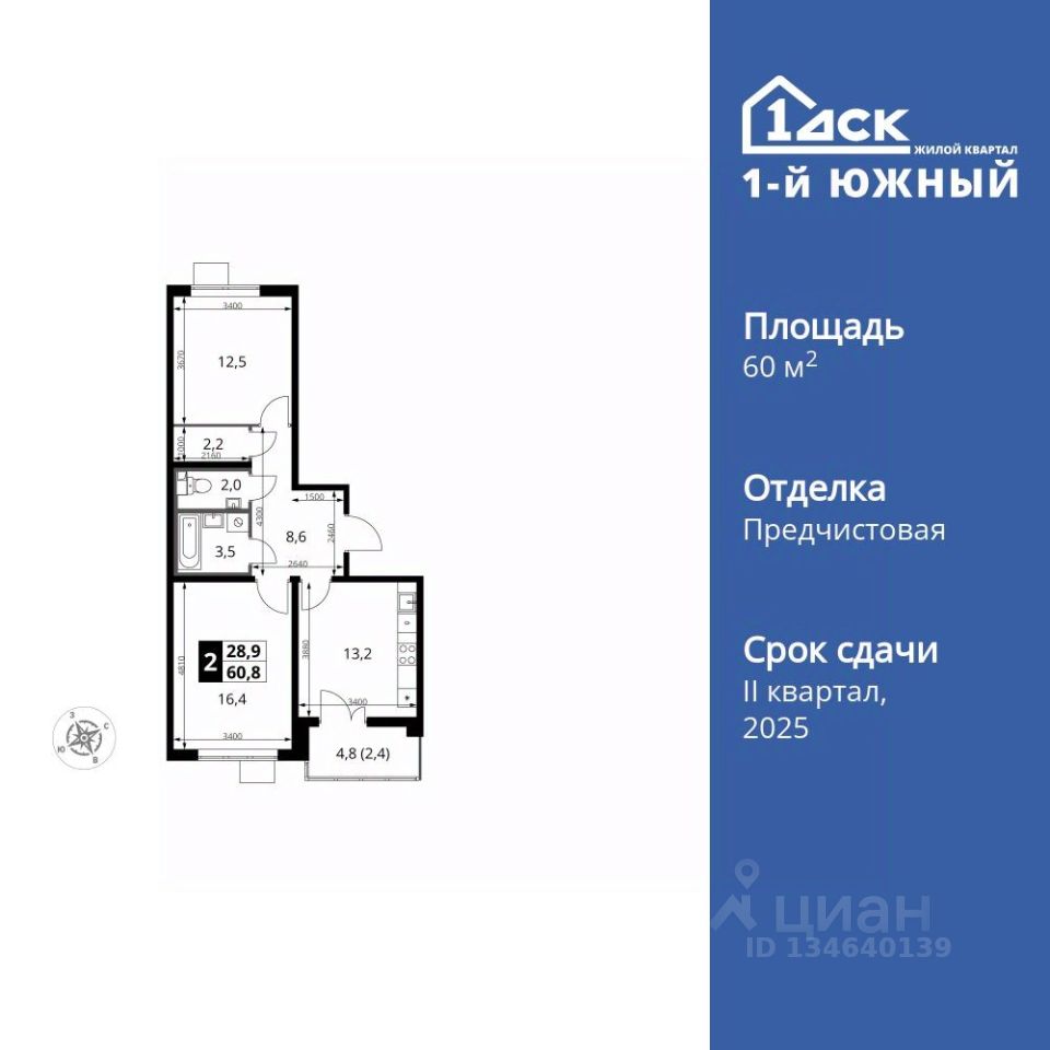 Продаётся 2-к квартира номер 535 общей площадью 60.8 кв.м. на 7-м этаже 25 этажного здания. Отделка Whitebox. Цена с учётом скидки.