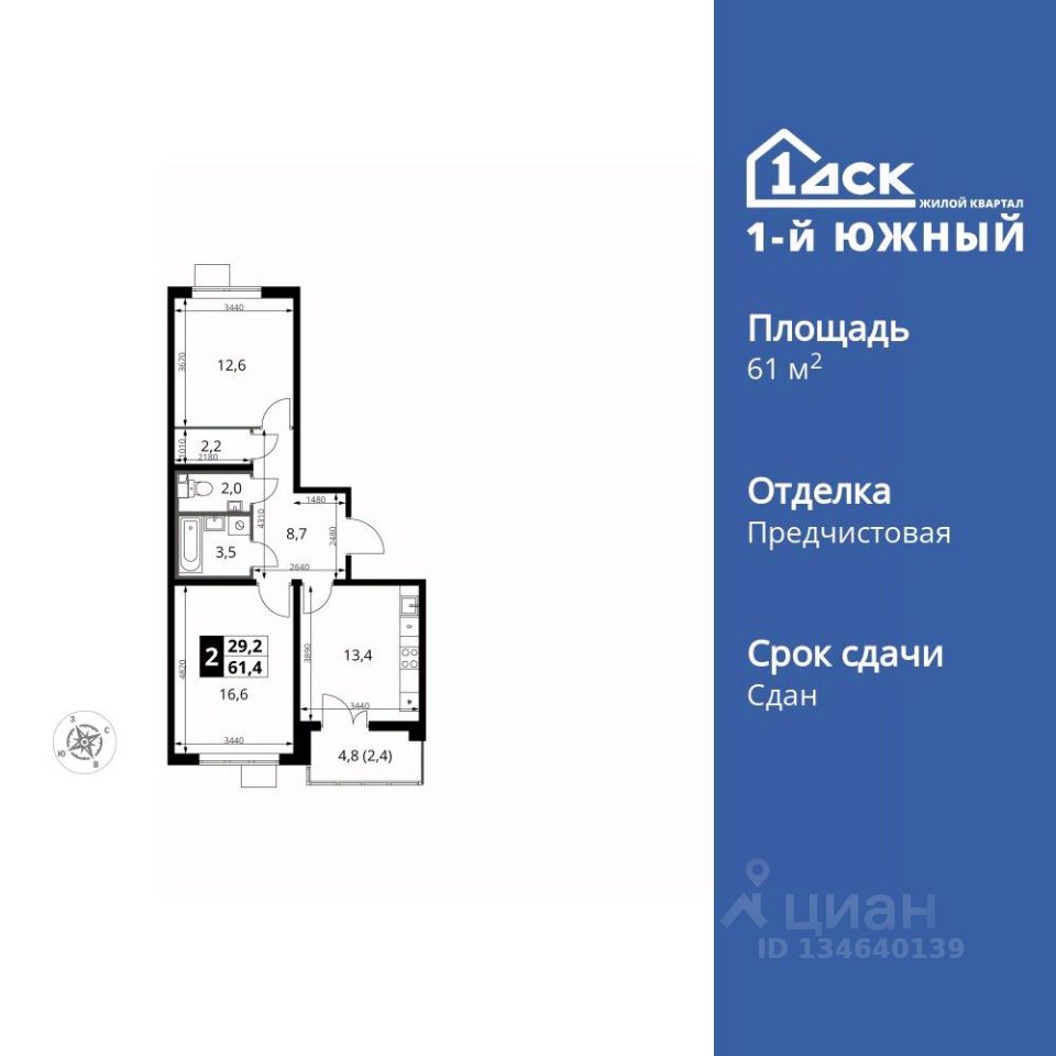 Продаётся 2-к квартира номер 619 общей площадью 61.4 кв.м. на 19-м этаже 25 этажного здания. Отделка Whitebox. Цена с учётом скидки.