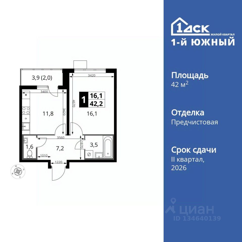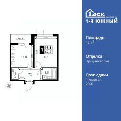 Продаётся 1-к квартира номер 179 общей площадью 42.2 кв.м. на 22-м этаже 25 этажного здания. Отделка Whitebox.
