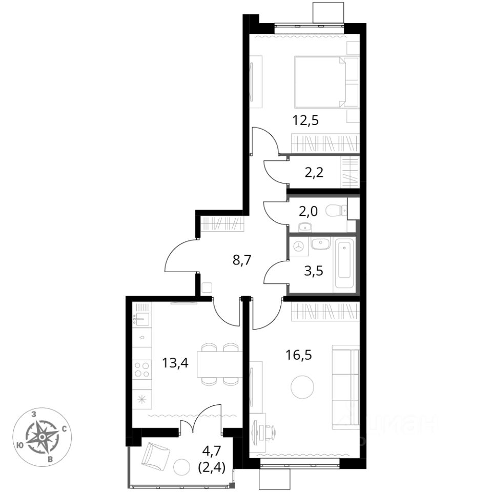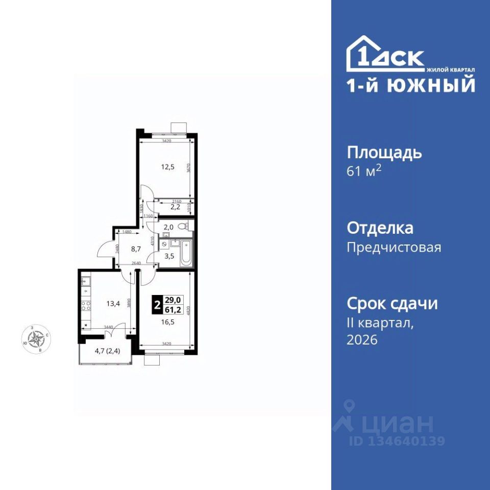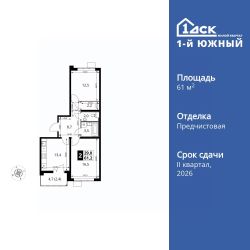 Продаётся 2-к квартира номер 456 общей площадью 61.4 кв.м. на 12-м этаже 24 этажного здания. Отделка Whitebox. Цена с учётом скидки.