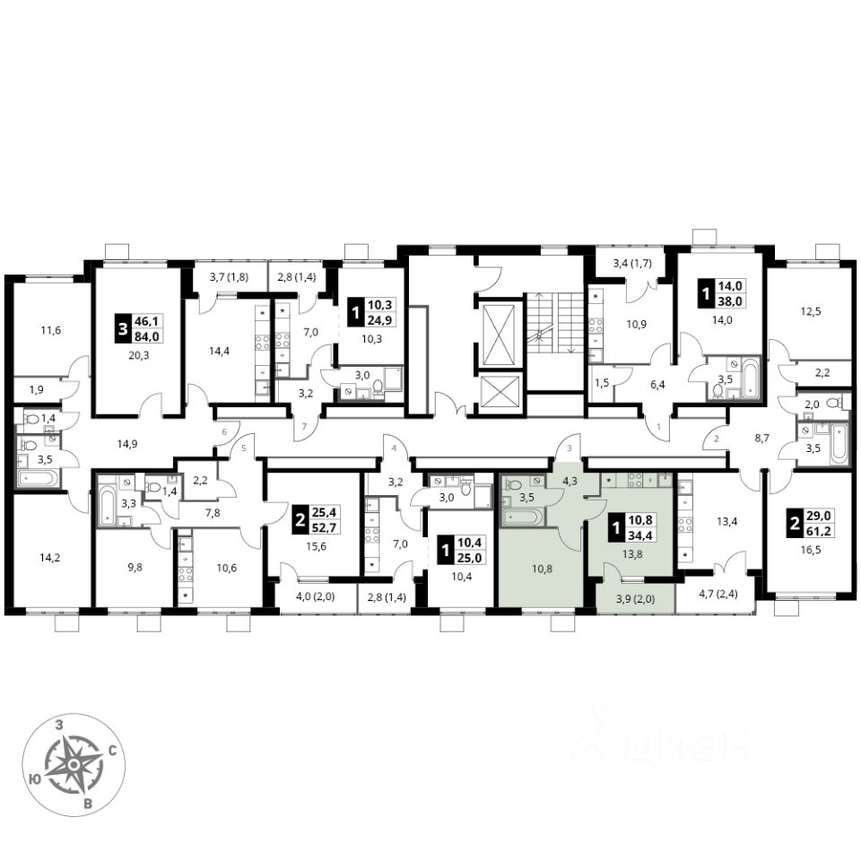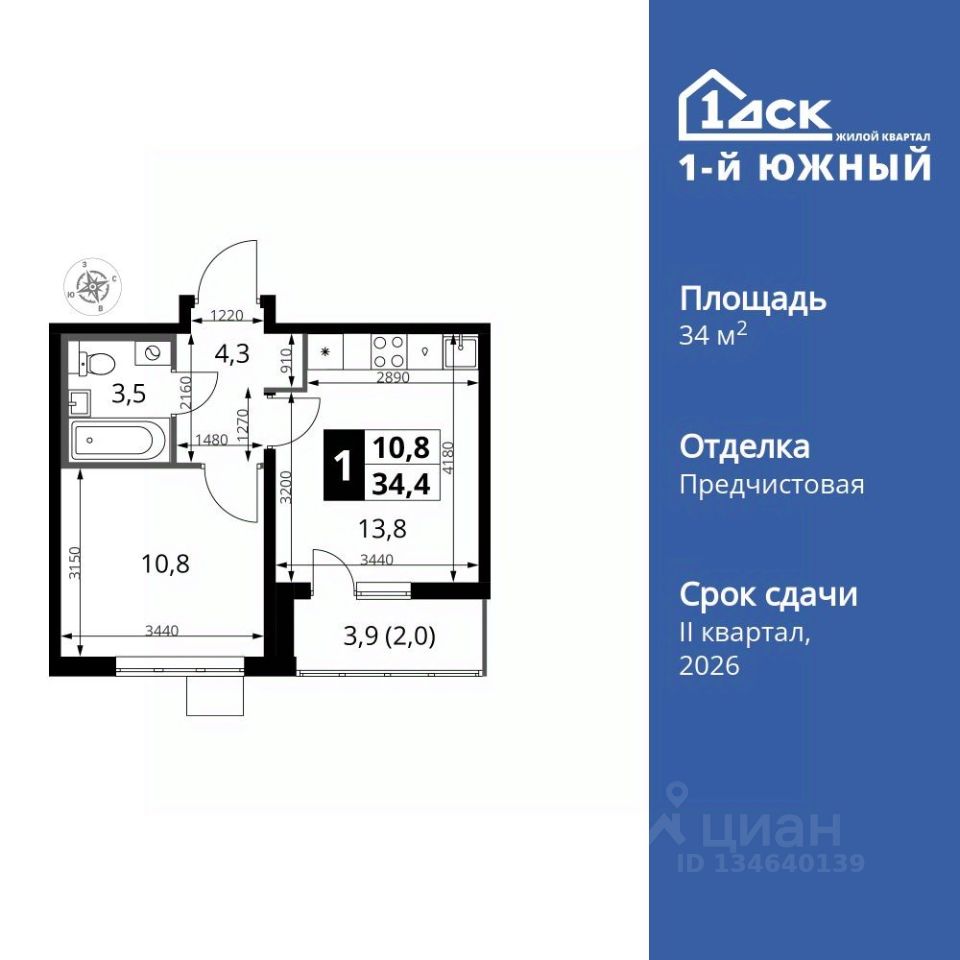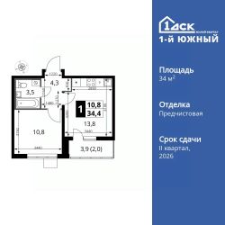 Продаётся 1-к квартира номер 485 общей площадью 34.4 кв.м. на 16-м этаже 24 этажного здания. Отделка Whitebox.