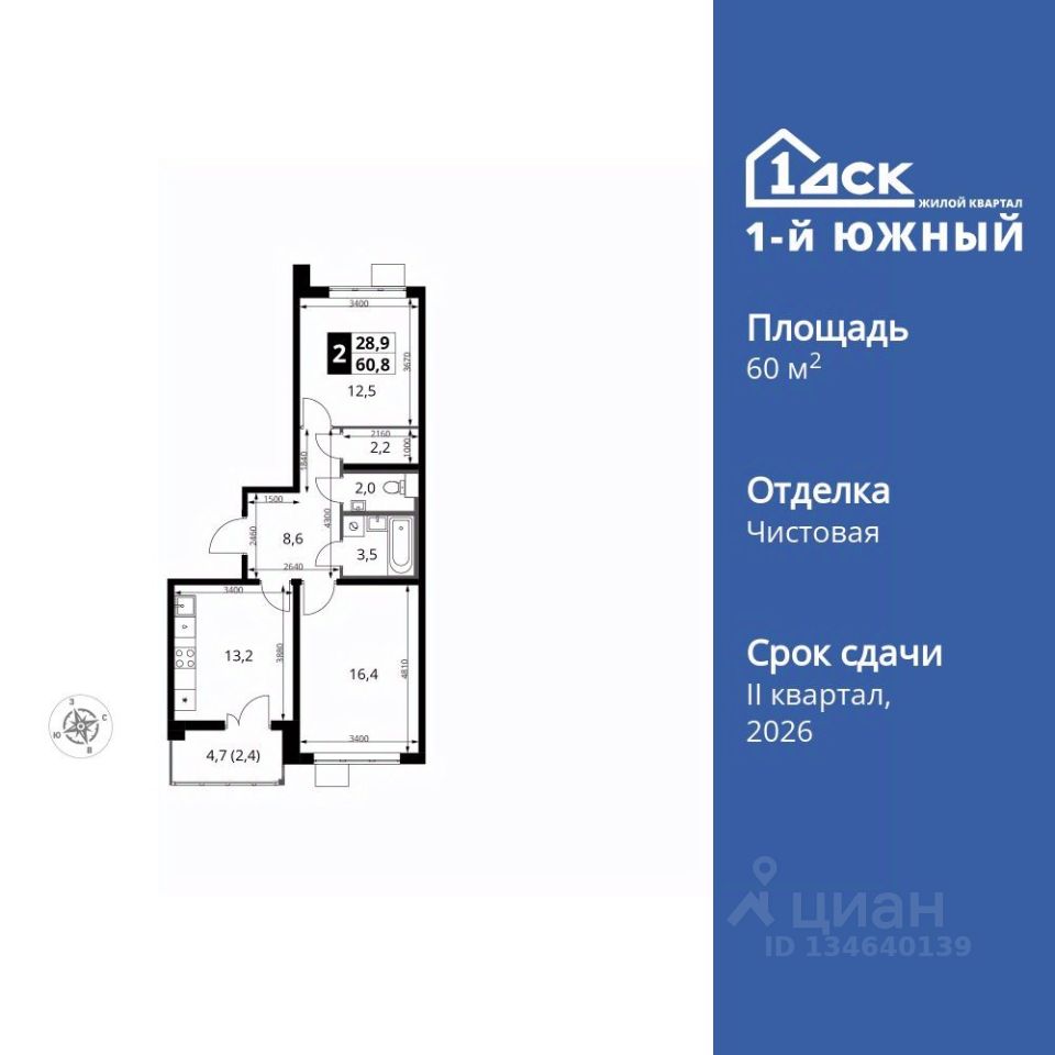 Продаётся 2-к квартира номер 849 общей площадью 60.8 кв.м. на 9-м этаже 24 этажного здания. Чистовая отделка. Цена с учётом скидки.