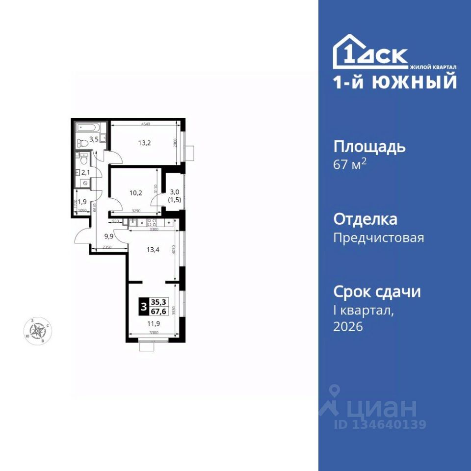 Продаётся 3-к квартира номер 223 общей площадью 67.6 кв.м. на 7-м этаже 25 этажного здания. Отделка Whitebox. Цена с учётом скидки.