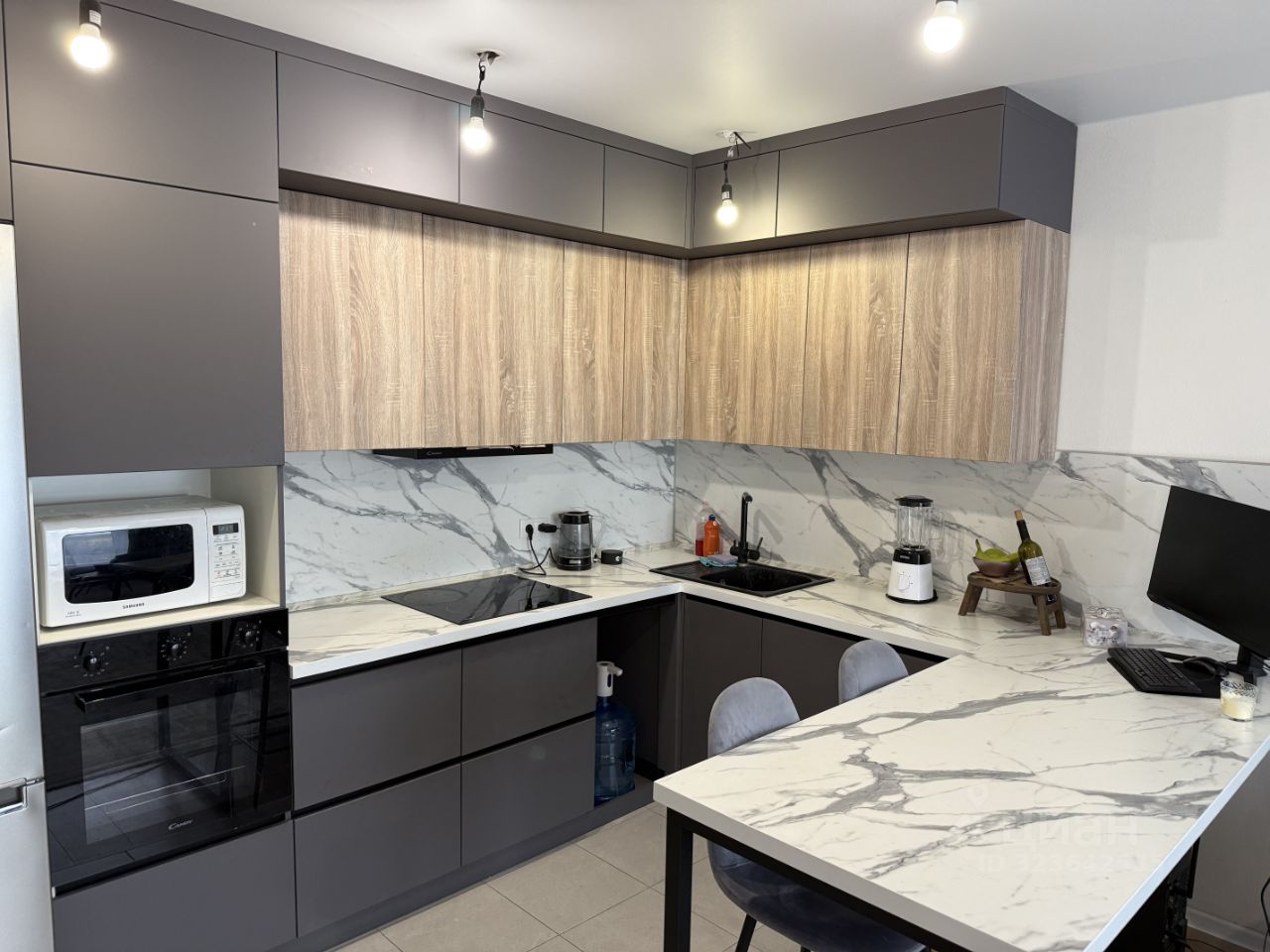 • Встроенный кухонный гарнитур, техника: варочная панель, духовой шкаф, вытяжка, микроволновка, холодильник.