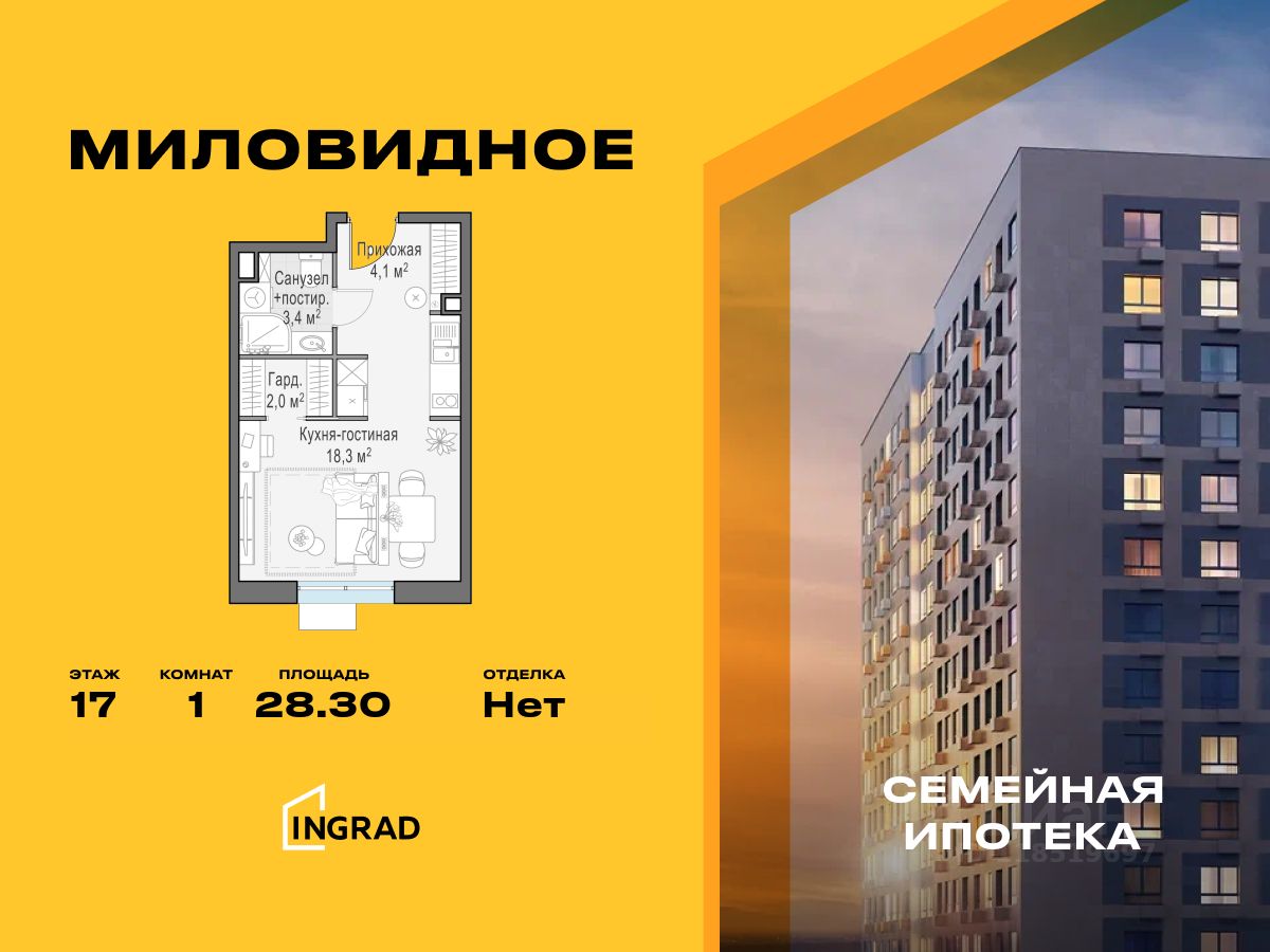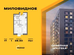 Прямая продажа от застройщика. В жилом квартале комфорт-класса Миловидное (застройщик ГК Инград) продаётся студия площадью 28.30 кв.м без отделки. Квартира расположена на 17 этаже 17-этажного дома, корпус 1.