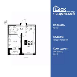 Продаётся 1-к квартира номер 384 общей площадью 40 кв.м. на 15-м этаже 24 этажного здания. Отделка Whitebox.