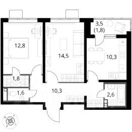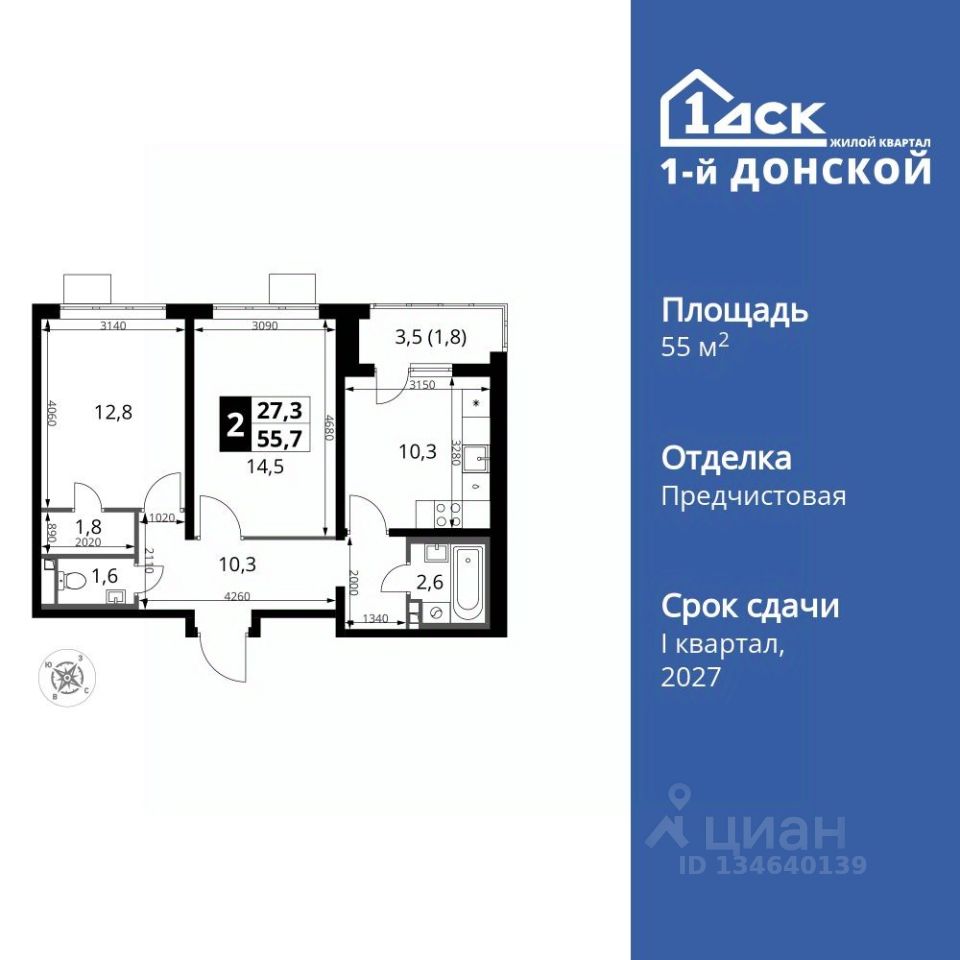 Продаётся 2-к квартира номер 566 общей площадью 55.7 кв.м. на 11-м этаже 24 этажного здания. Отделка Whitebox.
