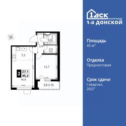 Продаётся 2-к квартира номер 675 общей площадью 45.2 кв.м. на 23-м этаже 24 этажного здания. Отделка Whitebox.