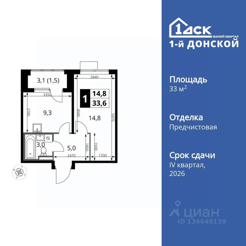 Продаётся 1-к квартира номер 139 общей площадью 33.6 кв.м. на 14-м этаже 24 этажного здания. Отделка Whitebox.