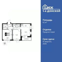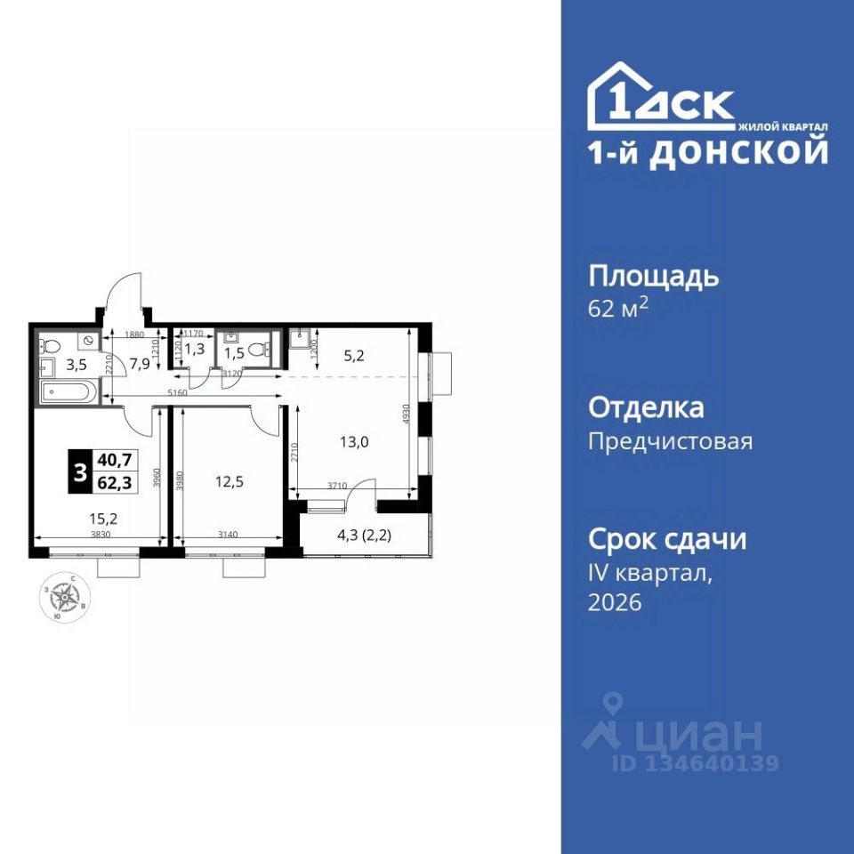 Продаётся 3-к квартира номер 401 общей площадью 62.3 кв.м. на 16-м этаже 24 этажного здания. Отделка Whitebox.