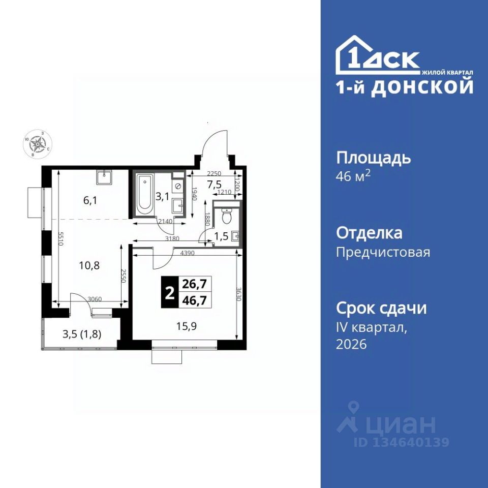 Продаётся 2-к квартира номер 941 общей площадью 46.7 кв.м. на 24-м этаже 24 этажного здания. Отделка Whitebox.