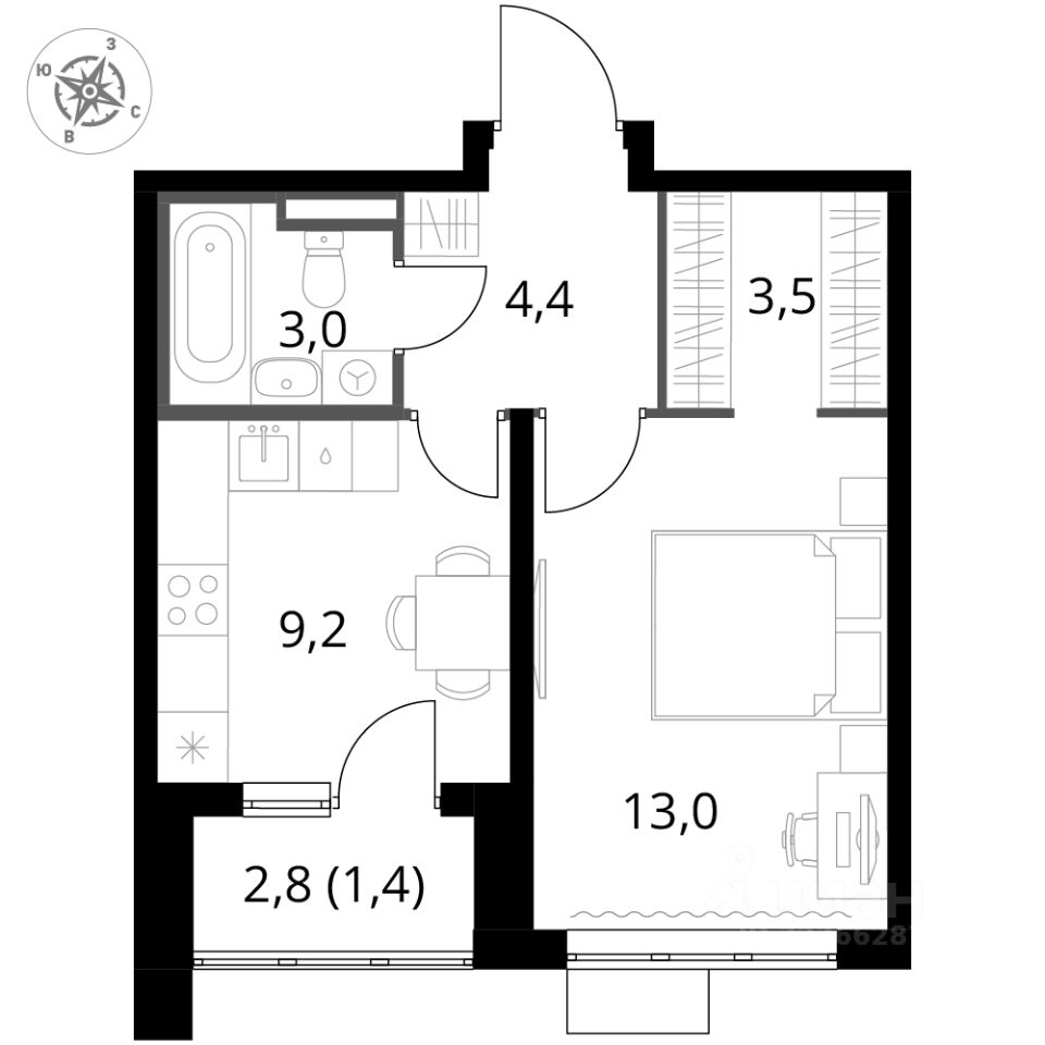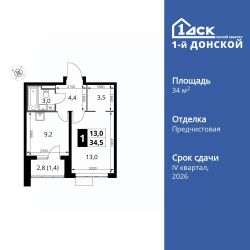 Продаётся 1-к квартира номер 794 общей площадью 34.5 кв.м. на 8-м этаже 24 этажного здания. Отделка Whitebox.