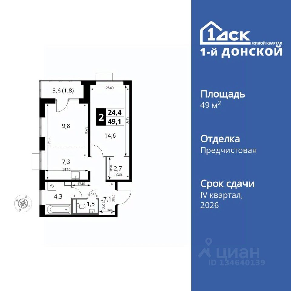 Продаётся 2-к квартира номер 852 общей площадью 49.1 кв.м. на 14-м этаже 24 этажного здания. Отделка Whitebox.