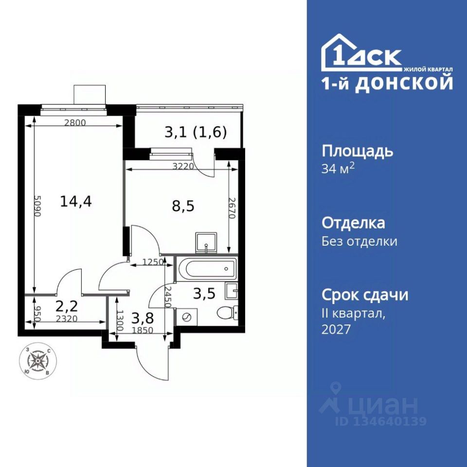 Продаётся 1-к квартира номер 94 общей площадью 34 кв.м. на 10-м этаже 24 этажного здания. Без отделки.
