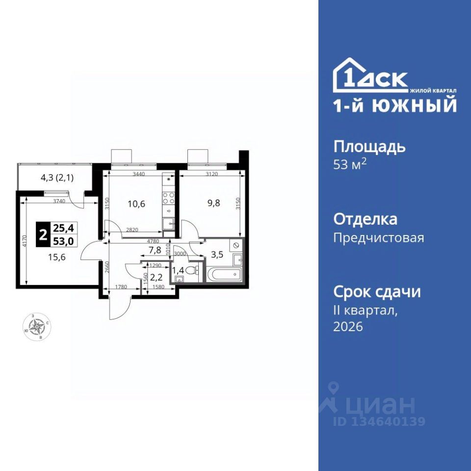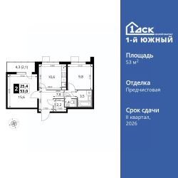 Продаётся 2-к квартира номер 304 общей площадью 53 кв.м. на 15-м этаже 25 этажного здания. Отделка Whitebox. Цена с учётом скидки.
