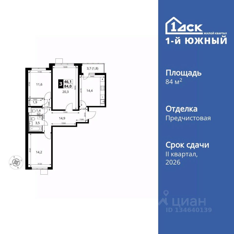 Продаётся 3-к квартира номер 530 общей площадью 84 кв.м. на 22-м этаже 24 этажного здания. Отделка Whitebox. Цена с учётом скидки.