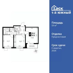 Продаётся 2-к квартира номер 620 общей площадью 59 кв.м. на 12-м этаже 24 этажного здания. Отделка Whitebox. Цена с учётом скидки.