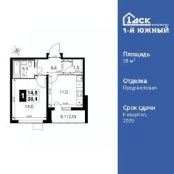 Продаётся 1-к квартира номер 632 общей площадью 38.4 кв.м. на 14-м этаже 24 этажного здания. Отделка Whitebox.