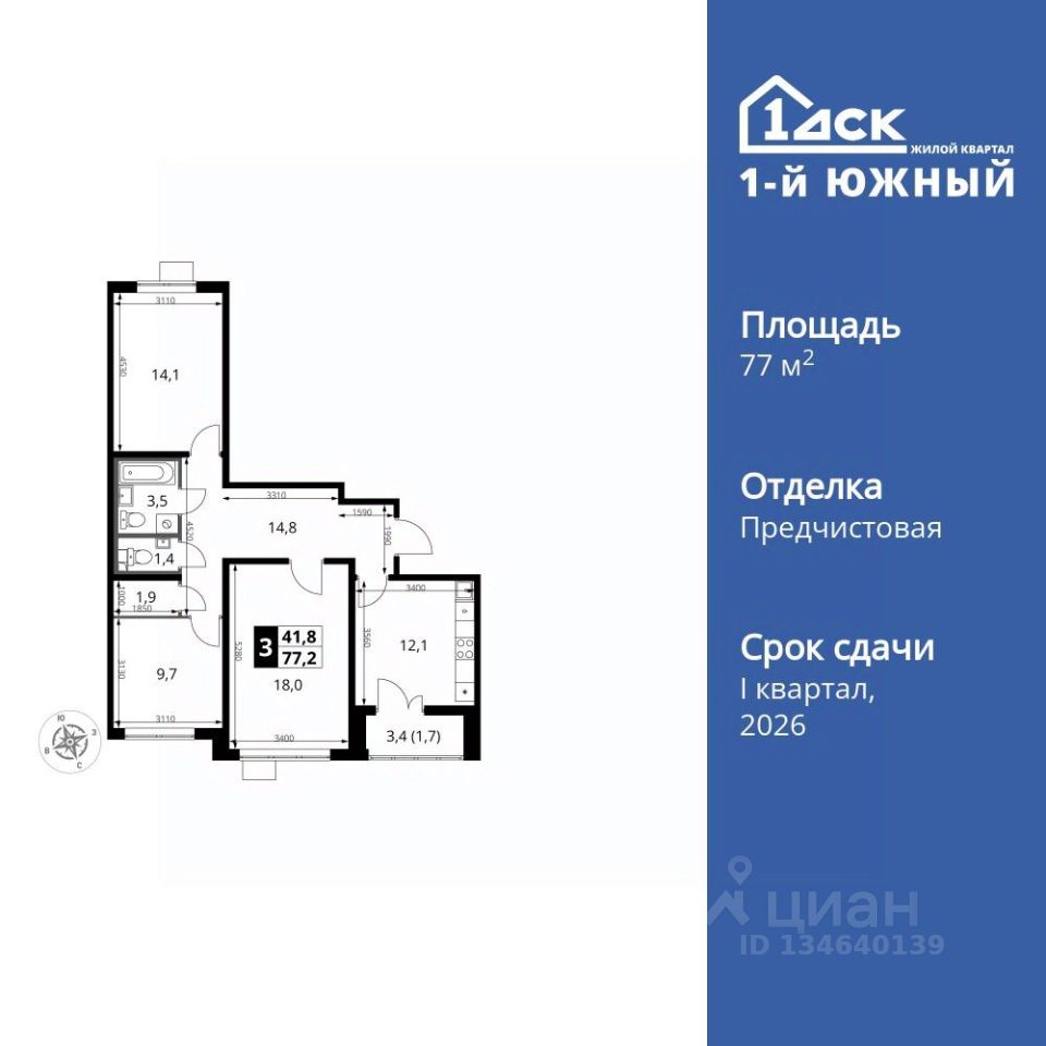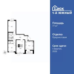 Продаётся 3-к квартира номер 125 общей площадью 77.2 кв.м. на 9-м этаже 25 этажного здания. Отделка Whitebox. Цена с учётом скидки.