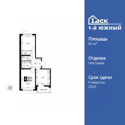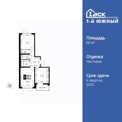 Продаётся 2-к квартира номер 374 общей площадью 60.8 кв.м. на 8-м этаже 25 этажного здания. Чистовая отделка. Цена с учётом скидки.