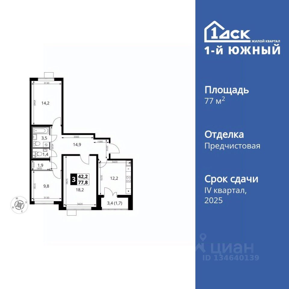 Продаётся 3-к квартира номер 173 общей площадью 77.9 кв.м. на 21-м этаже 25 этажного здания. Отделка Whitebox. Цена с учётом скидки.