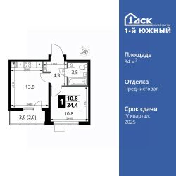 Продаётся 1-к квартира номер 333 общей площадью 34.3 кв.м. на 25-м этаже 25 этажного здания. Отделка Whitebox. Цена с учётом скидки.