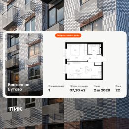 Продаётся 1-комн. квартира площадью 37,2 кв.м на 22 этаже 25 этажного дома (Корпус 55, Секция 1) проекта ПИК Восточное Бутово. Светлый просторный подъезд на уровне земли, функциональная планировка, большие окна, предчистовая отделка.