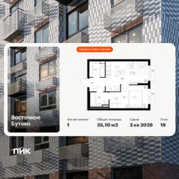 Продаётся 1-комн. квартира площадью 35,1 кв.м на 18 этаже 25 этажного дома (Корпус 55, Секция 1) проекта ПИК Восточное Бутово. Светлый просторный подъезд на уровне земли, функциональная планировка, большие окна, предчистовая отделка.