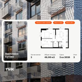 Продаётся 2-комн. квартира площадью 48 кв.м на 2 этаже 25 этажного дома (Корпус 48, Секция 4) проекта ПИК Восточное Бутово. Светлый просторный подъезд на уровне земли, функциональная планировка, большие окна, предчистовая отделка.