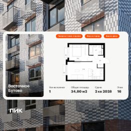 Продаётся 1-комн. квартира площадью 34,8 кв.м на 16 этаже 17 этажного дома (Корпус 48, Секция 2) проекта ПИК Восточное Бутово. Светлый просторный подъезд на уровне земли, функциональная планировка, большие окна, предчистовая отделка.