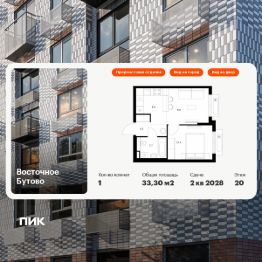 Продаётся 1-комн. квартира площадью 33,3 кв.м на 20 этаже 25 этажного дома (Корпус 48, Секция 4) проекта ПИК Восточное Бутово. Светлый просторный подъезд на уровне земли, функциональная планировка, большие окна, предчистовая отделка.