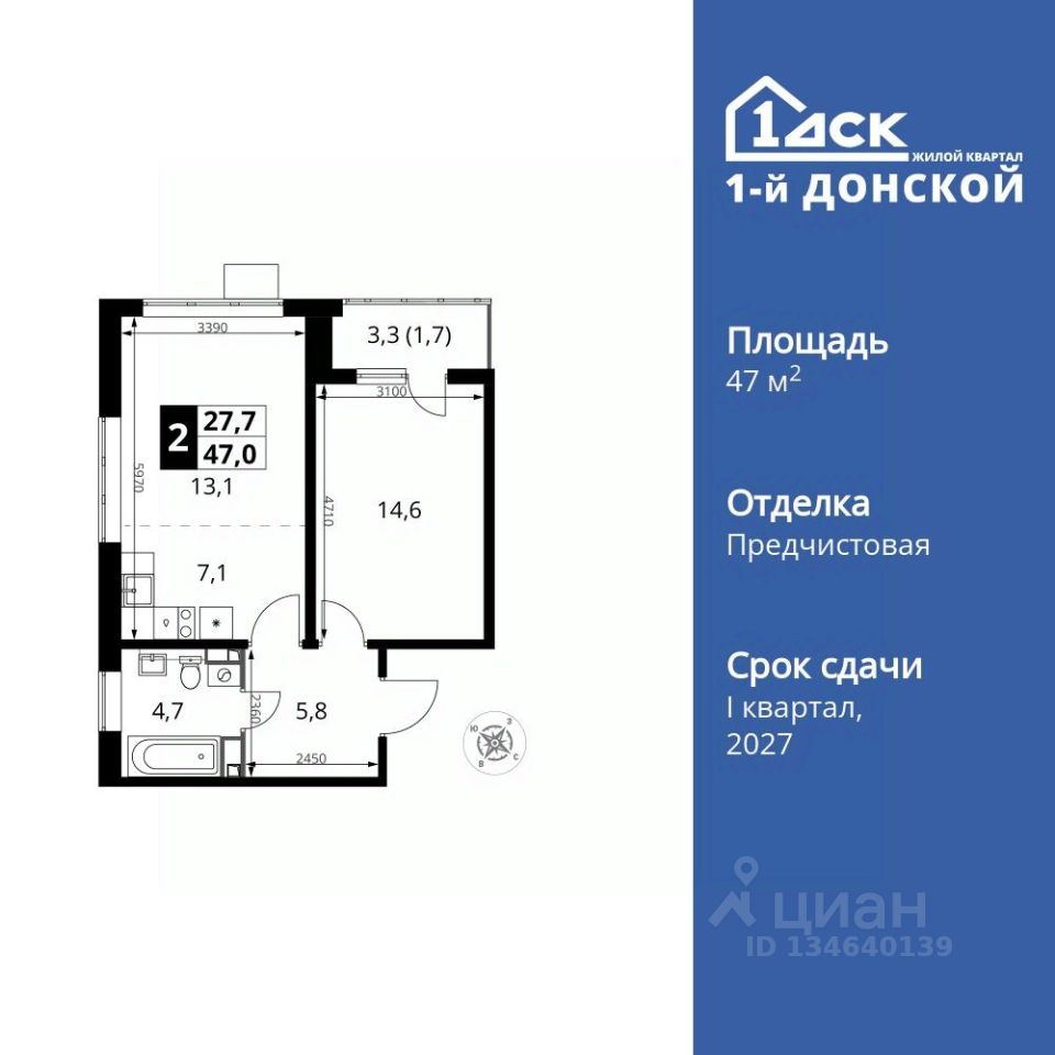 Продаётся 2-к квартира номер 702 общей площадью 47 кв.м. на 3-м этаже 24 этажного здания. Отделка Whitebox.