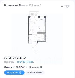 Продаётся студия площадью 23,07 кв.м. с чистовой отделкой и с мебелью! Высота потолков 3 метра.