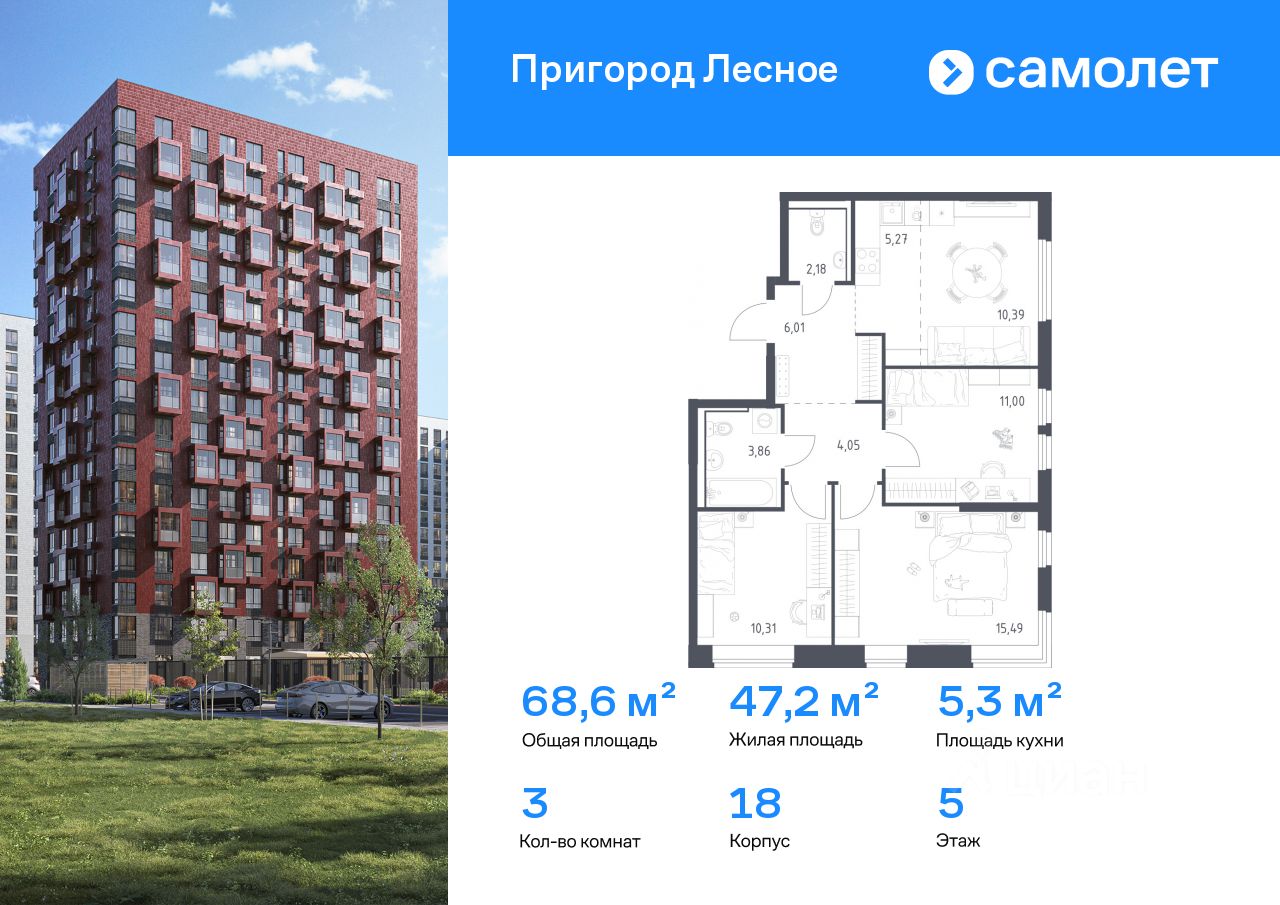 Строим кварталы для жизни с заботой о будущем. Предлагается 3-комнатная квартира комфорт-класса 68,56 кв.м в корпусе 18 на 5 этаже, в ЖК "Пригород Лесное"