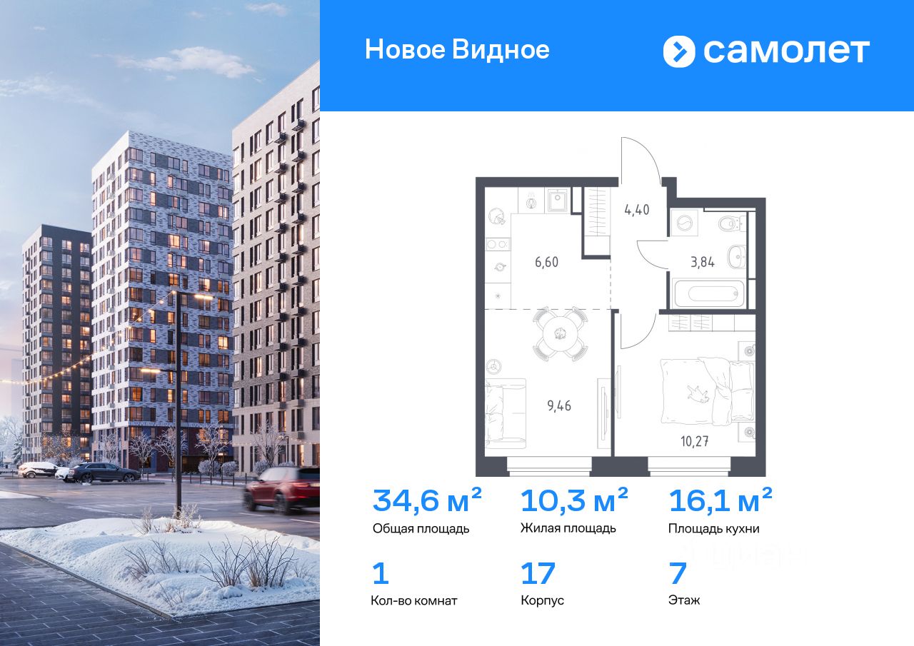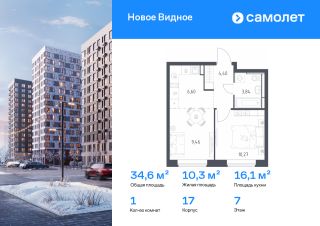 Строим кварталы для жизни с заботой о будущем. Предлагается 1-комнатная квартира комфорт-класса 34,57 кв.м в корпусе 17 на 7 этаже, в ЖК "Новое Видное"
