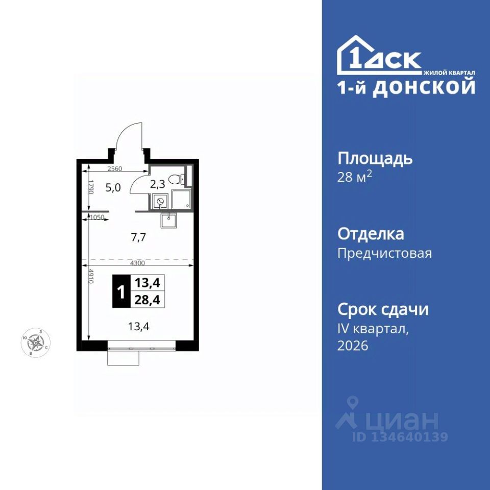 Продаётся квартира-студия номер 520 общей площадью 28.4 кв.м. на 5-м этаже 24 этажного здания. Отделка Whitebox.