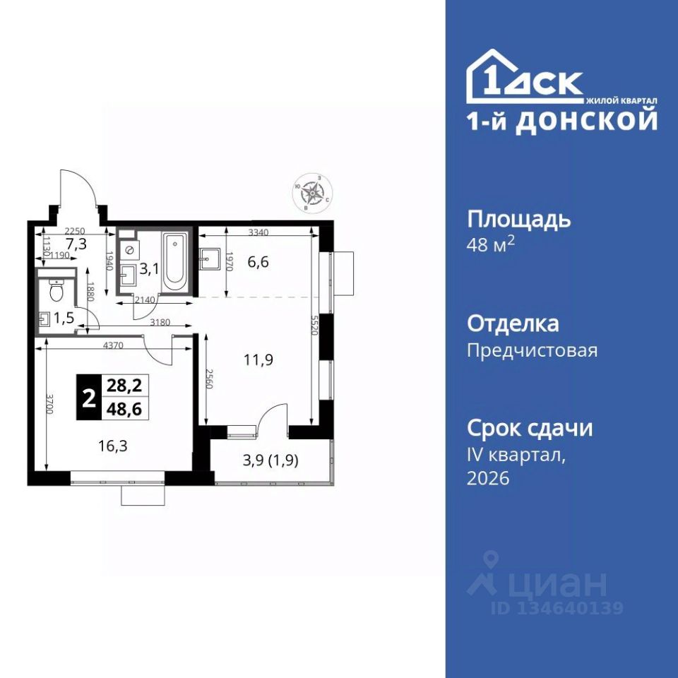 Продаётся 2-к квартира номер 585 общей площадью 48.6 кв.м. на 11-м этаже 24 этажного здания. Отделка Whitebox.