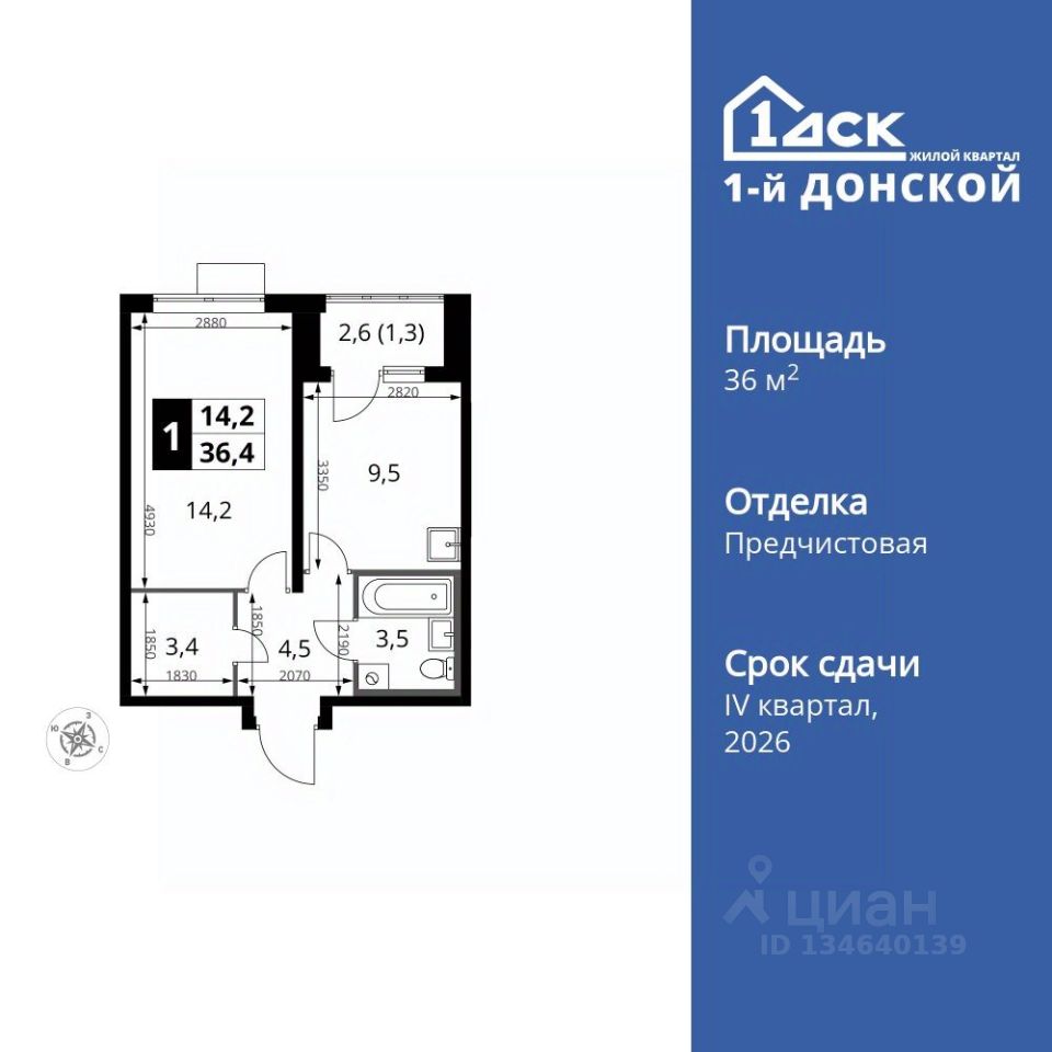 Продаётся 1-к квартира номер 763 общей площадью 36.4 кв.м. на 4-м этаже 24 этажного здания. Отделка Whitebox.