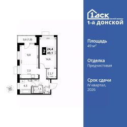Продаётся 2-к квартира номер 897 общей площадью 49.1 кв.м. на 19-м этаже 24 этажного здания. Отделка Whitebox.