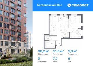 Строим кварталы для жизни с заботой о будущем. Предлагается 3-комнатная квартира комфорт-класса 88,24 кв.м в корпусе 7.2 на 9 этаже, в ЖК "Богдановский Лес"