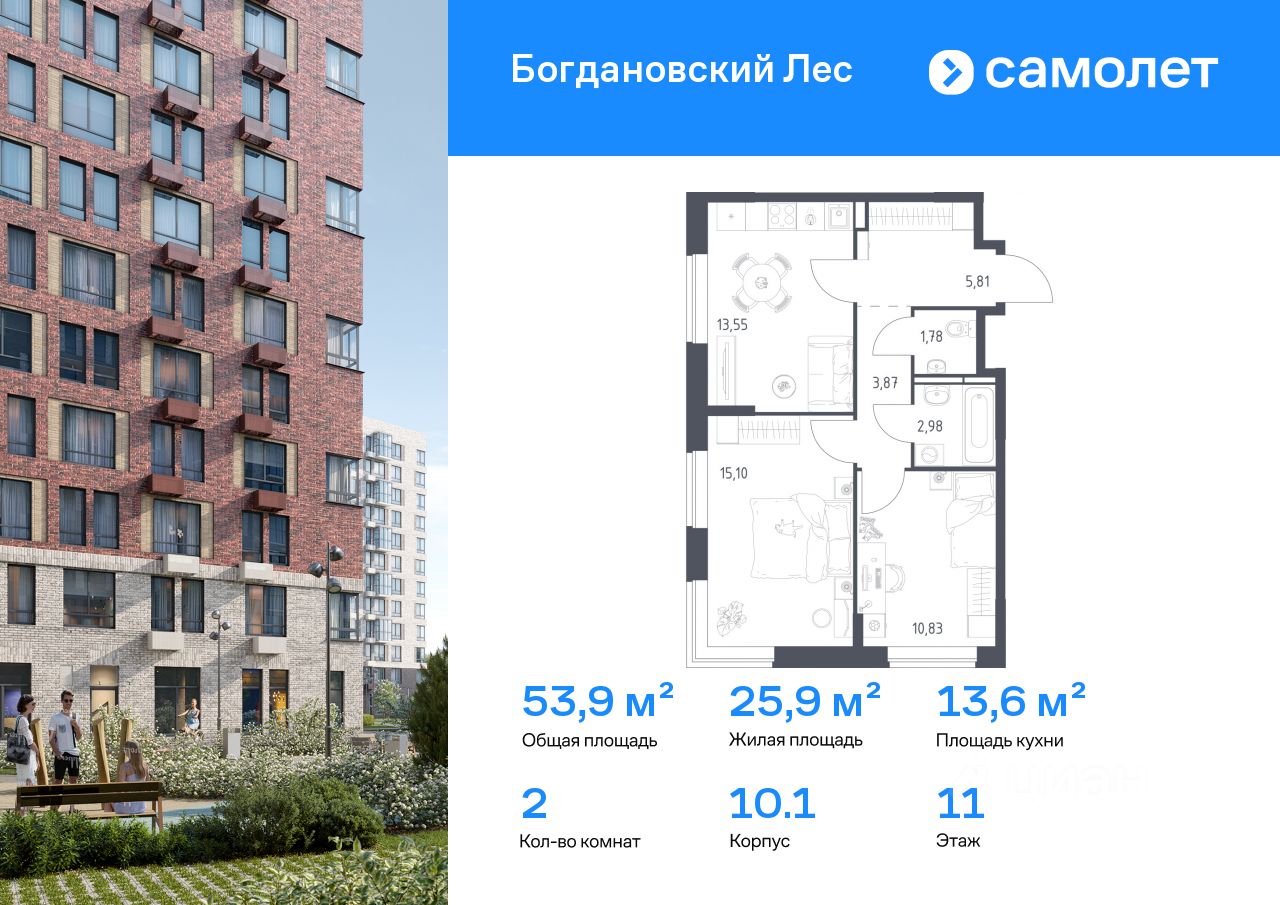 Строим кварталы для жизни с заботой о будущем. Предлагается 2-комнатная квартира комфорт-класса 53,92 кв.м в корпусе 10.1 на 11 этаже, в ЖК "Богдановский Лес"