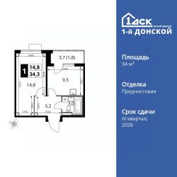 Продаётся 1-к квартира номер 129 общей площадью 34.3 кв.м. на 13-м этаже 24 этажного здания. Отделка Whitebox.