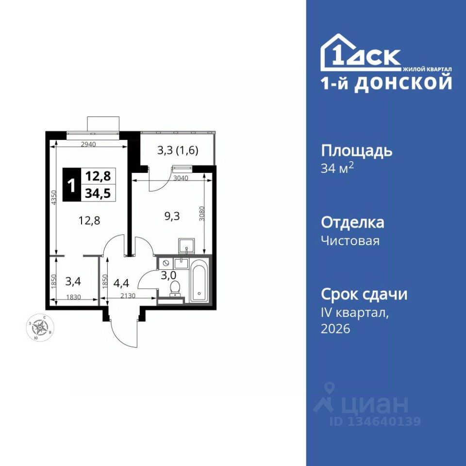 Продаётся 1-к квартира номер 358 общей площадью 34.5 кв.м. на 12-м этаже 24 этажного здания. Чистовая отделка.