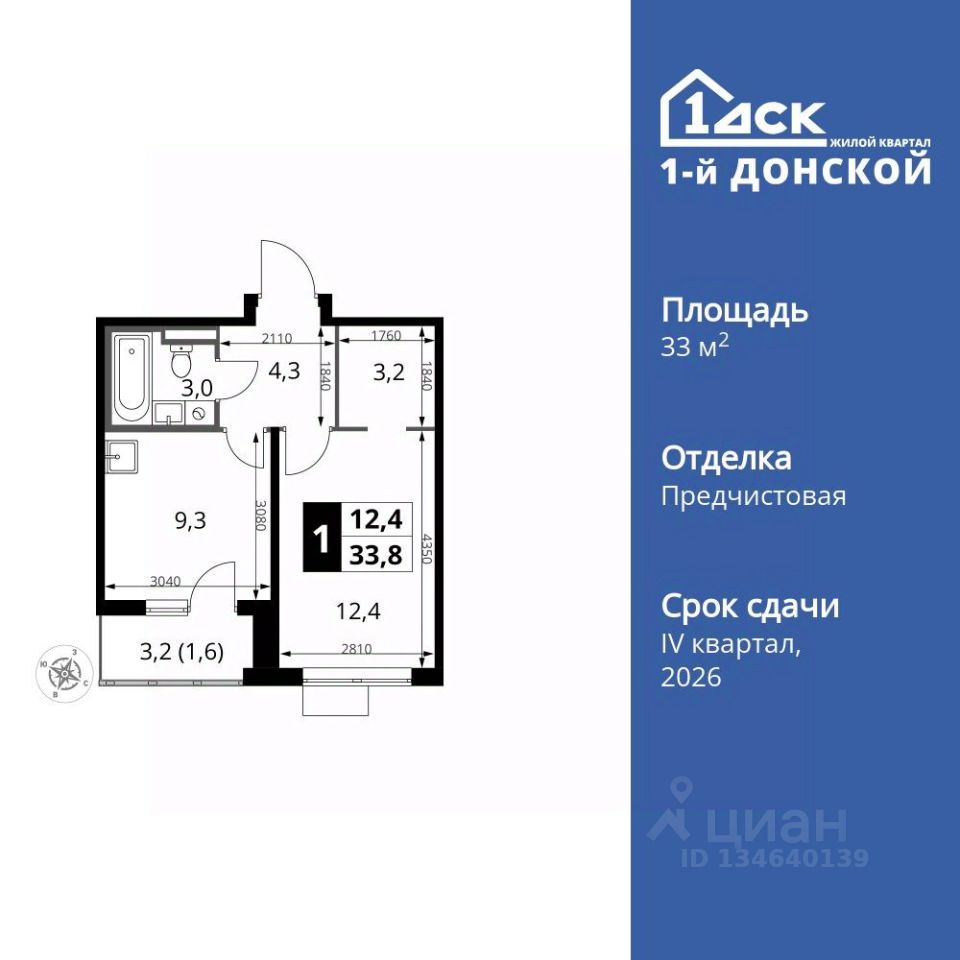 Продаётся 1-к квартира номер 611 общей площадью 33.8 кв.м. на 13-м этаже 24 этажного здания. Отделка Whitebox.