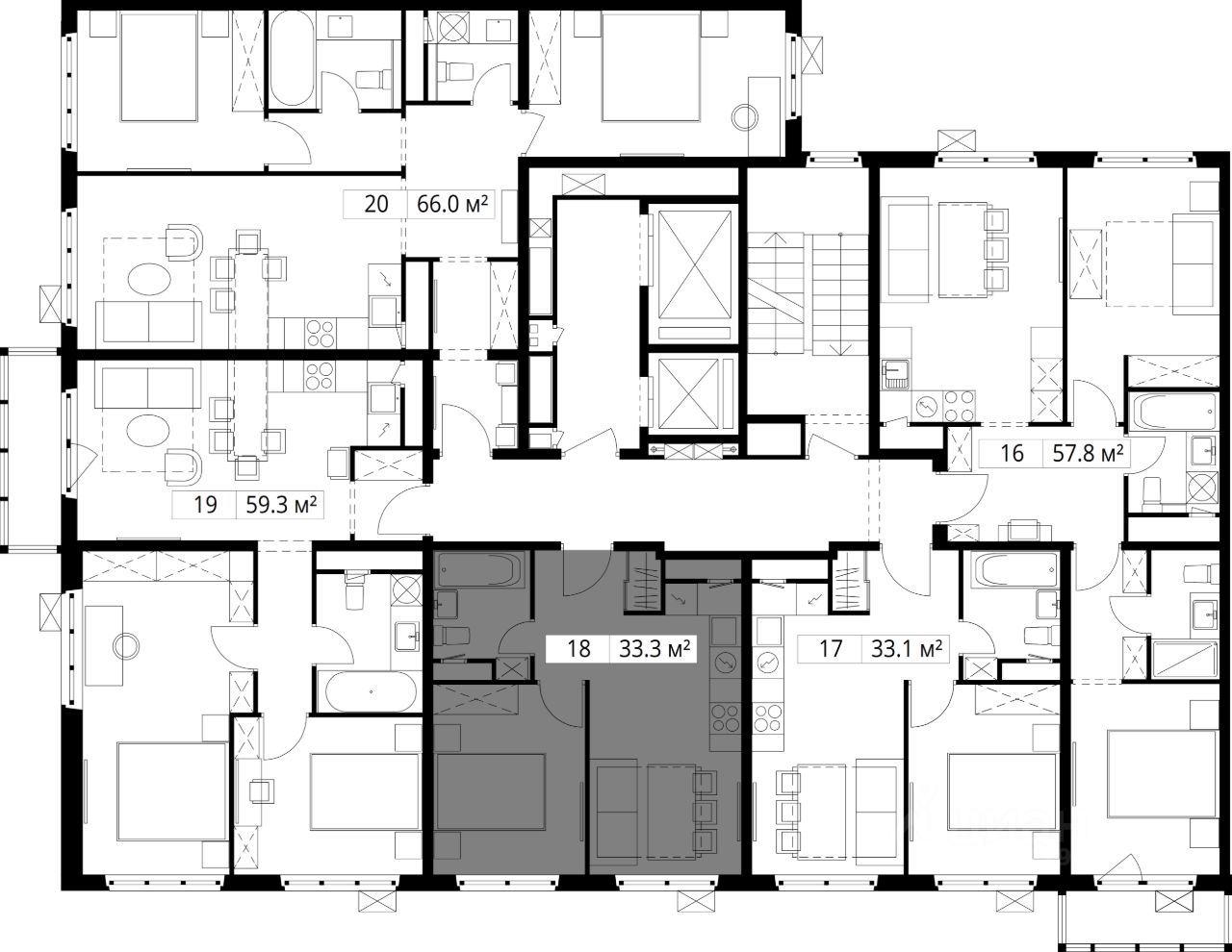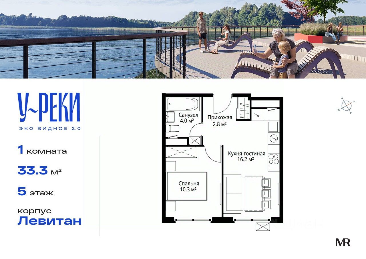 Продаётся 1-комнатная квартира общей площадью 33.30 м² с предчистовой отделкой в ЖК "У реки. Эко Видное 2.0" на 5-м этаже 17 этажного корпуса Левитан.